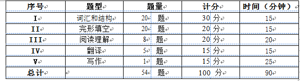 試卷題型分為五個部分:詞匯和結(jié)構(gòu)、完形填空、閱讀理解、翻譯(漢譯英)和寫作。考試時(shí)間總計(jì) 90 分鐘,滿分為 100 分,達(dá)到 60 分為合格。試卷內(nèi)容結(jié)構(gòu)如下: