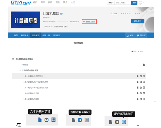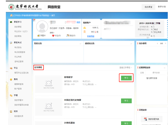 1、登錄后,進入主頁面,找到在學課程,然后進入學習。